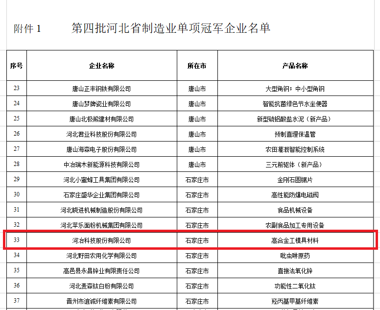 河冶科技股份有限公司獲得河北省單項(xiàng)冠軍企業(yè)認(rèn)定